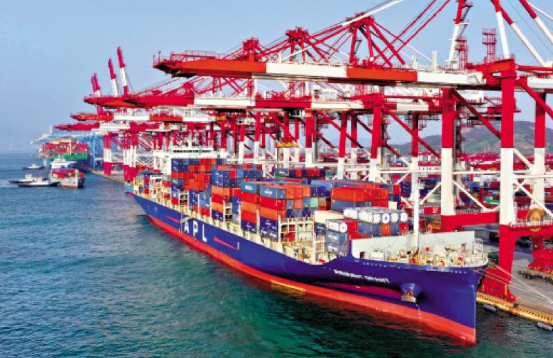 图片:10月14日起,内地将对涉美船舶征收特殊港口费。图为山东青岛的一批货物正在装卸集装箱。 \ 新华社