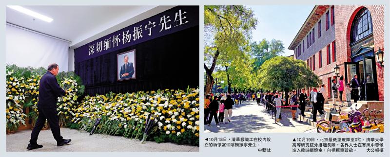 左图:10月18日,清华大学教职员工在校内设立的纪念室吊唁杨振宁先生。 \ 中新社;右图:10月19日,北京最低气温降至0℃,清华大学高等研究院外排起长队。各界人士在寒风中等待进入临时纪念室,瞻仰杨振宁。 \ 大公报 摄 10月18日,诺贝尔物理学奖获得者、中国科学院院士、著名物理学家杨振宁在北京去世,享年103岁。科学界各界人士深深缅怀杨振宁,向科学界不朽的传奇人物致敬。 - 科学。他们认为他是世界著名的物理学家,是心系家国的童真典范。清华大学在Adv研究所设立临时纪念室杨振宁一生工作的地方——书房,接受师生和社会各界人士的慰问。 19日上午,吊唁门外排起了几十米长的队伍,还有一些人从外地赶来悼念杨振宁先生。一名在清华大学就读的香港学生接受大公报记者采访时表示,杨振宁先生不仅是一位科学大师,也是一位伟大的爱国者。大公报记者郭汉林在北京从杨振宁报道,人们了解了中国科学家的理想和行为——不仅延续了中国传统文化伟大的血脉,更激发了开拓创新的科学精神;不仅有博大的胸怀和真挚的爱国心,而且有勉励自己“宁哀勿技,宁朴勿光荣”的大师品格。他卓越的学术水平、高尚的情操和道德品格给人们留下了重要的影响。世界上的精神财富。寒冷的空气中,人们排队表达哀悼。清华校园里的一栋红砖小楼是清华大学高等研究院,杨振宁晚年就职于此。 19日,北京最低气温降至0℃,但前来吊唁的人们仍然排起了长队,在寒冷的空气中默默表达对杨振宁的哀思和敬意。进入研究所大门后,吊唁人员可以在119室前接受鲜花和签名。墙上还贴着杨振宁先生生平的介绍。哀悼者集体进入119房间后,可以向杨振宁先生的遗像献花、三鞠躬。吊唁仪式隆重、庄严。之后,吊唁人员可以自行收到“杨辰宁先生生平”的介绍。生平简介的最后写着:杨振宁的生平事迹。两个世纪以来,连接着中西文化,探索未知的不朽传奇,祖国在他心中永恒的回响。 “与其笨拙,不如简单,不如美丽”,是他的学术行为,也是他的生活态度。他将自己的人生比作“一个圆”,从清华大学出发,经过世界舞台,最后回到家乡。记者了解到,纪念室10月18日至24日每天上午9点至晚上9点开放。距离-19次开通还有半个小时,门外已经有很多人等待了。清华大学学生王告诉大公报记者,他的中学物理老师让他帮忙预约入学,所以他专程从辽宁沉阳赶来慰问。外国游客李女士约好今天带女儿去清华大学参观。尼埃莱亚得知有纪念杨振宁先生的追悼会,就前去吊唁。 “杨先生的作品能够激励孩子们努力学习、报效国家。”培养中国科研骨干,为前来吊唁的香港学生做出非凡贡献,清华大学新闻传播学院博士生陈家成在接受大公报记者采访时表示,杨振宁先生是近几十年来对物理学做出重大贡献的大师,也是一位伟大的爱国者。 “我在学校参加了一部话剧《马兰花开》,主要讲述了《两弹一星》创始人邓稼先的故事。2023年,他回到香港旅游。大家都知道,杨先生和邓先生是从小就是朋友。我给杨振宁留下了临别赠言——‘期待生生万里’。” ”他说,清华的风格和成就正是源于清华几代人强烈的使命感、责任感和责任感。它体现了清华精神的丰富性和中华民族自强不息的精神。清华大学教育学院在港学生陈春霖表示,“归根结底”是杨振宁先生放弃美国国籍,全职回到清华任教的居所。这也是他每次路过都会停下来看看的院落。八十多岁回到清华后,他仍然坚持给本科生讲课。他推动建立的清华高等研究院在理论物理、定量信息等领域走在世界前列。杨振宁讲座基金已资助百余名青年学者,其中不少人已成为我国科研的中坚力量。 “先生对科学的坚持扎实的研究和他对国家的深厚感情是我们这一代学生应该记住的。”“今天我带来了一张来自牛津大学的迈克尔的照片。布朗斯坦教授的课程笔记截图,很好地总结了杨先生的贡献。”香港清华大学自动化系研究生林成浩表示,杨振宁先生1954年提出的《大公报》理论描述了除引力之外自然界中所有已知的基本相互作用,相关研究对他很有启发。 上一篇:行业观点/嘉下大规模分期付款交易有望接踵而至